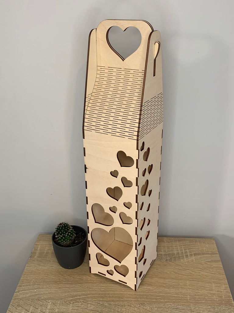 The hearts wine box is a beautiful way to give that special someone a lovely bottle of wine or maybe even spirits. The unique design uses flexible living hinges for a stylish touch.